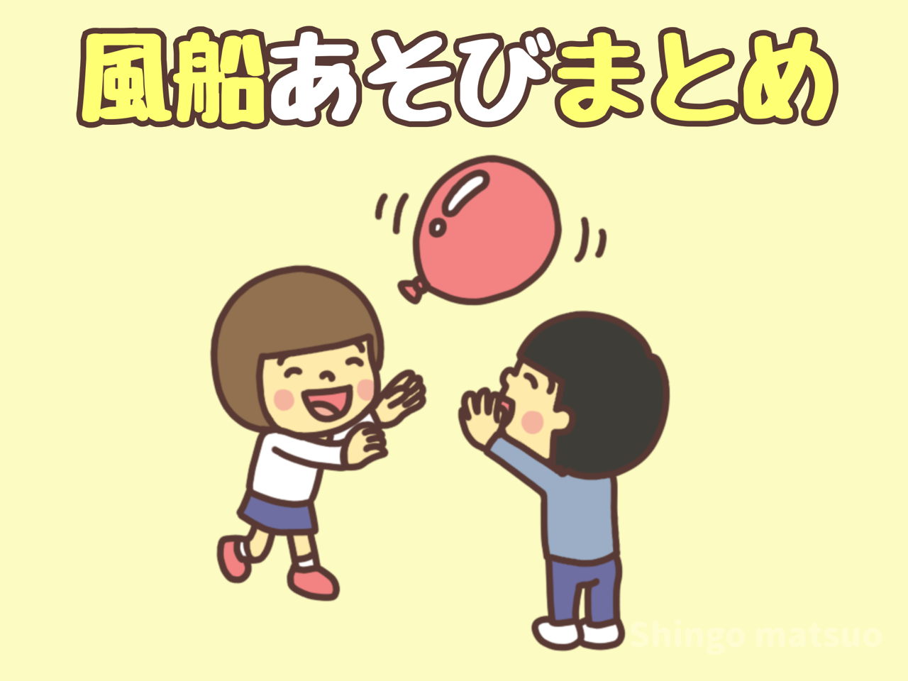 風船で遊ぶ子ども(男の子と女の子)のイラスト。ふうせん、幼児、小学生、風船遊び、児童館、保育園、幼稚園、小学校、放課後等デイサービス(放デイ)、特別支援学校、学童保育、体育館、プレイルーム、教室、リビング(おうち遊び)、雨の日の室内、レク大...
