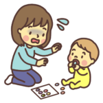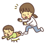 部屋の中に落ちている物を誤飲しそうになる子どもを見て慌てる母親のイラスト