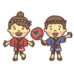 すべて子ども祭りで手作りの「お面屋さん」をして遊ぶ子どものイラストです。児童館祭り、学童祭り、公民館祭り、ペットボトル、バネ、トイレットペーパーの芯、蛙。