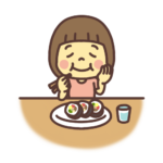 【食事】ほっぺたに手を当てて巻き寿司を食べる子ども(女の子)のイラスト。キンパ、巻き寿司、まきすし、海苔巻き、のりまき、海苔巻、恵方巻き、恵方巻、巻き寿司、皿の上のまき寿司を箸で食べる、ほっぺたが落ちそうな美味しさ。しんごパパ「ウ・ヨンウ弁...