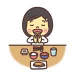 【食事】ほっぺたに手を当てて巻き寿司を食べる子ども(女の子)のイラスト。キンパ、巻き寿司、まきすし、海苔巻き、のりまき、海苔巻、恵方巻き、恵方巻、巻き寿司、皿の上のまき寿司を箸で食べる、ほっぺたが落ちそうな美味しさ。しんごパパ「ウ・ヨンウ弁...