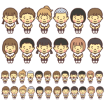 体育座りの女の子たち(6人横並び)のイラスト 14パターン