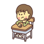 学校の教室で自分の席にすわりながら頬杖をついて考え込む男の子のイラスト2022年6月バージョン。悩む様子。イラストを描き直しました。お好みのイラストをお使い下さい。頬杖をついて悩む子どものイラスト2021年9月バージョン頬杖をついて悩む子ど...