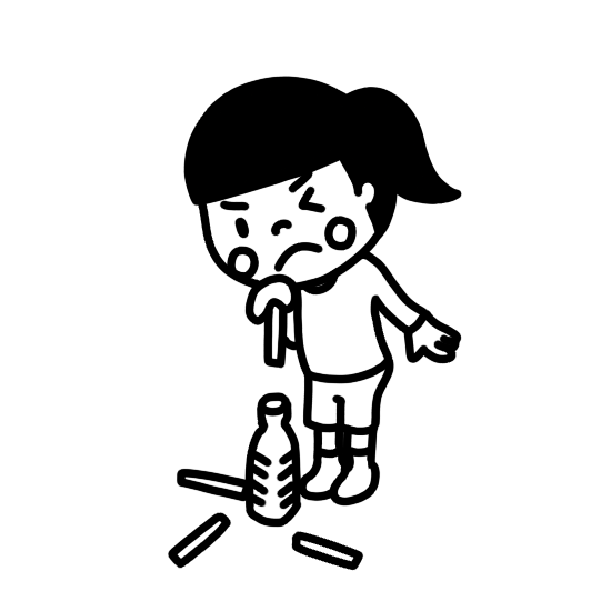 ペットボトルに割り箸を落とす女の子のイラスト モノクロ